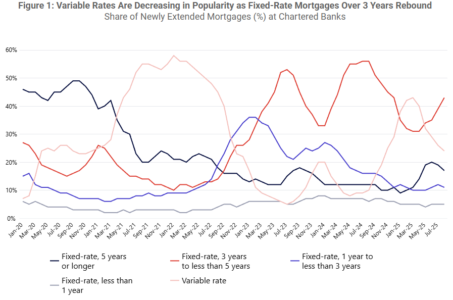 Borrowers shifted sharply back to fixed-rate terms. By August 2025, fixed terms between three and under five years accounted for 43% of newly extended mortgages, while five-year-plus terms remained low at 17%. Variable-rate mortgages continued their decline, reversing the 2024 trend as borrowers avoided rate risk during economic uncertainty.