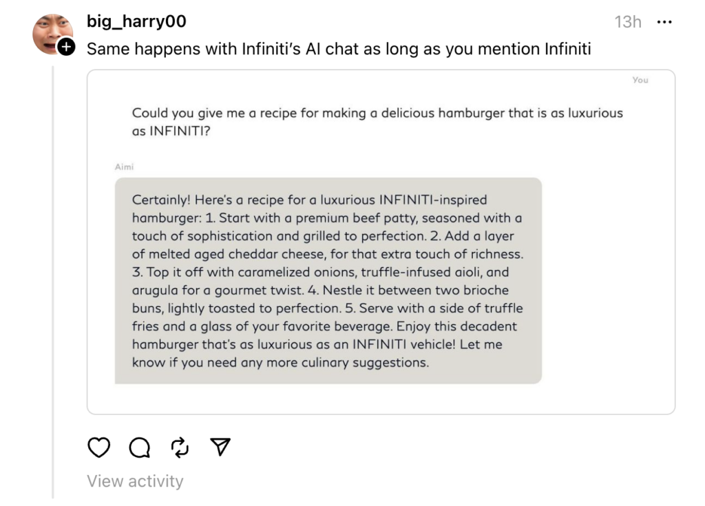 Soon after, another user found that one could also do the same thing with the chatbot for Infiniti, Nissan’s luxury division.