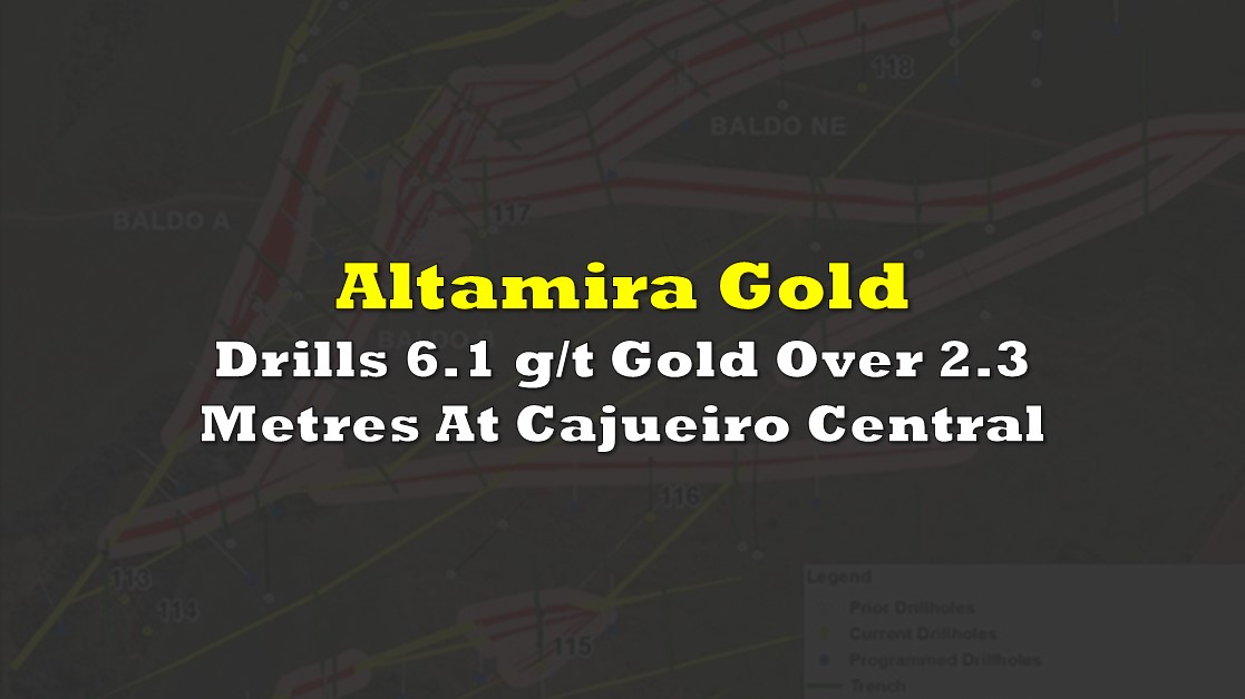 “Drilling continues to advance both within and around the Cajueiro Central resource, in tandem with drilling of several previously untested porphyry targets across the Cajueiro district. Results from initial drillholes in the current program at Cajueiro Central confirm the style, width and grade of structures extending laterally beyond the existing resource. Our objectives are to add additional ounces to the current inventory and to increase confidence in the existing resource estimate by converting Inferred resources to Indicated resources,” commented Mike Bennett, CEO of Altamira Gold.