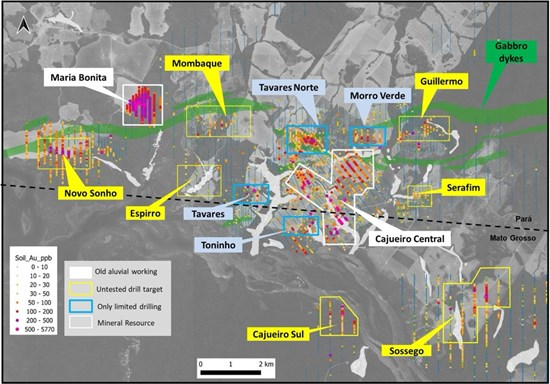 The program has seen initial scout drilling completed at two of nine porphyry targets within the Cajueiro district. The Tavares Norte and Morro Verde were the first two targets to be selected for drilling, both of which are found in a corridor that extends 8 kilometres east to west and is defined by gold anomalies in soils and chip samples.
