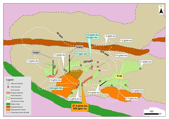 Further drilling intends to target the area to the east of hole TVN002, where the gold in soil anomaly increases in strength. That anomaly overall measures 1,800 metres by 1,300 metres in size, with surface grab samples assaying as high as 7.8 g/t gold.