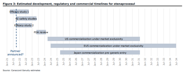 Canaccord forecasts that if or when Antibe out-licenses the commercial rights to otenaproxesul, the deal could be around US$215.0M in upfront and milestone fees, plus 15% sales royalties which is based on deals for similar drugs. The estimate also assumes it captures 24% of the patients on a prescription that sales would reach $5.2 billion in 2031.