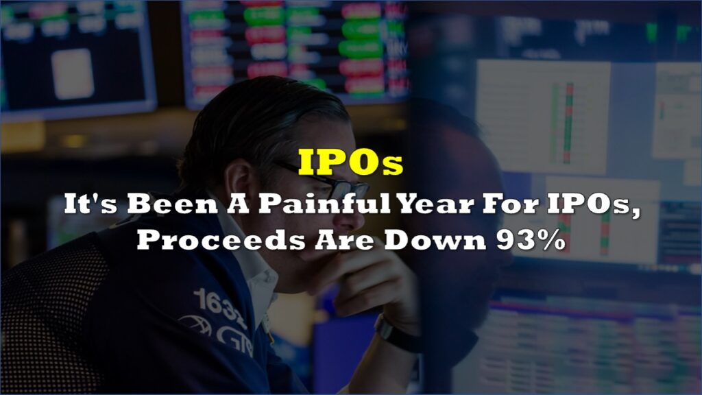 For the whole year, there were 149 IPOs in the United States in 2022, totaling $20.79 billion, compared to 908 IPOs in 2021, totaling $282.66 billion.
