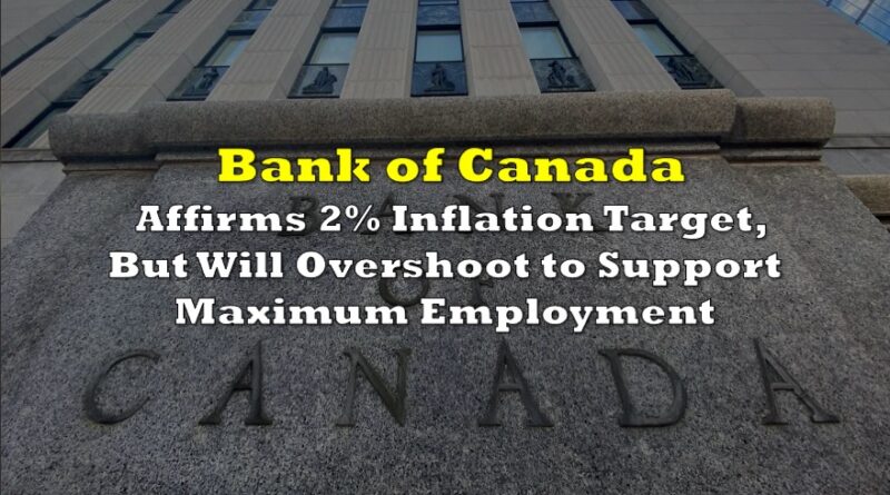 The Bank of Canada has renewed its mandate to keep inflation within the 2% target range, but did formally announce that it is prepared to let price pressures overshoot in order to reach maximum, sustainable employment.