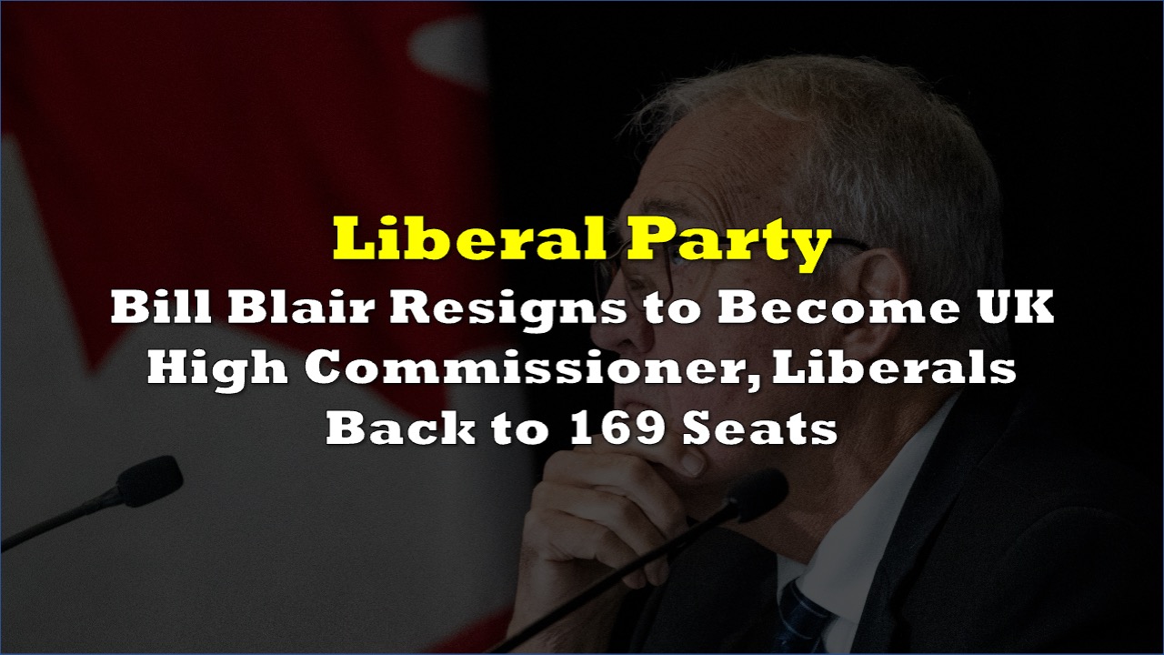 The Speaker of Canada’s House of Commons informed Parliament on Monday that Liberal MP Bill Blair has officially resigned his seat, reducing the Liberal Party’s seat count to 169.