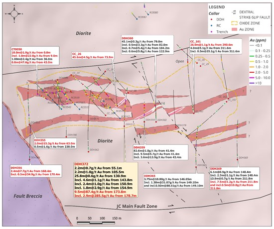 - DDH372: 9.5 metres of 87.4 g/t gold from a depth of 173.8 metres