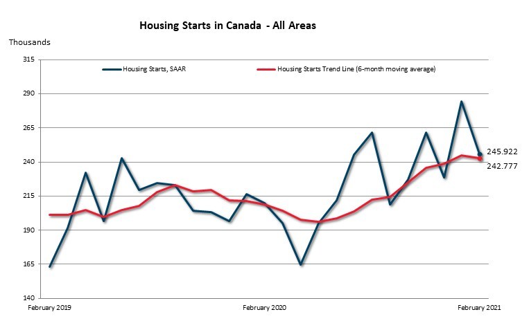 Following a strong start in the first month of the year, housing starts fell by 13.5% in February, despite real estate activity continuing to remain elevated. According to Canada Mortgage and Housing Corporation (CMHC), the seasonally adjusted annual rate of housing starts fell from 284,372 units to only 245,922 units in February. This puts the 6-month moving average at 242,777 units, down from 244,963 units in January.