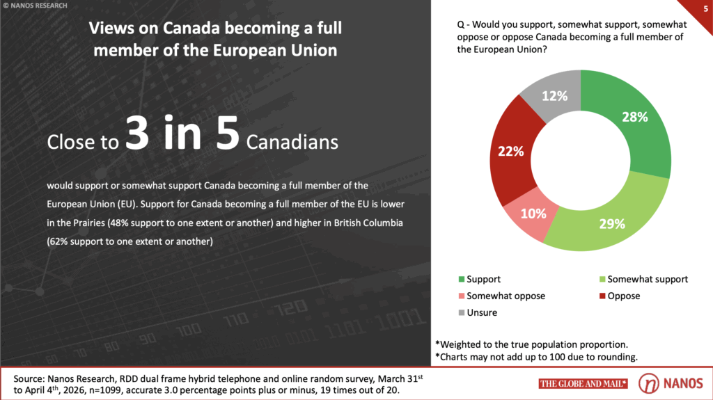 A recent Globe and Mail/Nanos survey found 56.8% of Canadians support or somewhat support Canada becoming a full EU member, including 28.2% who support the idea and 28.6% who somewhat support it. Another 31.2% oppose or somewhat oppose membership, while 11.9% are unsure.