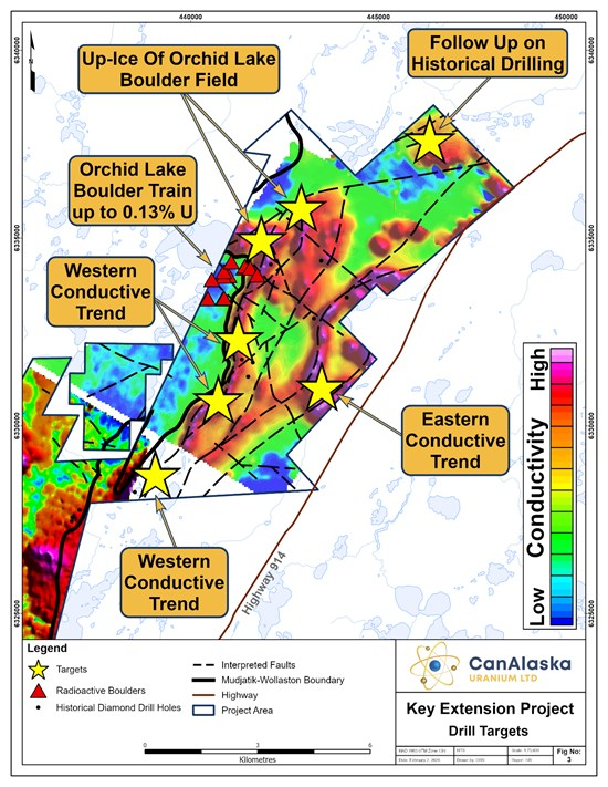 Four key targets are said to have been identified for the exploration program, including up-ice of the Orchid Lake Boulder Field, a 10 kilometre long western conductive trend, and a five kilometre long eastern conductive trend. A handful of drill holes also intend to follow up on historic drilling completed in 2007, one hole of which notably intersected 487.3 ppm uranium over 0.15 metres from a depth of 184.7 metres.