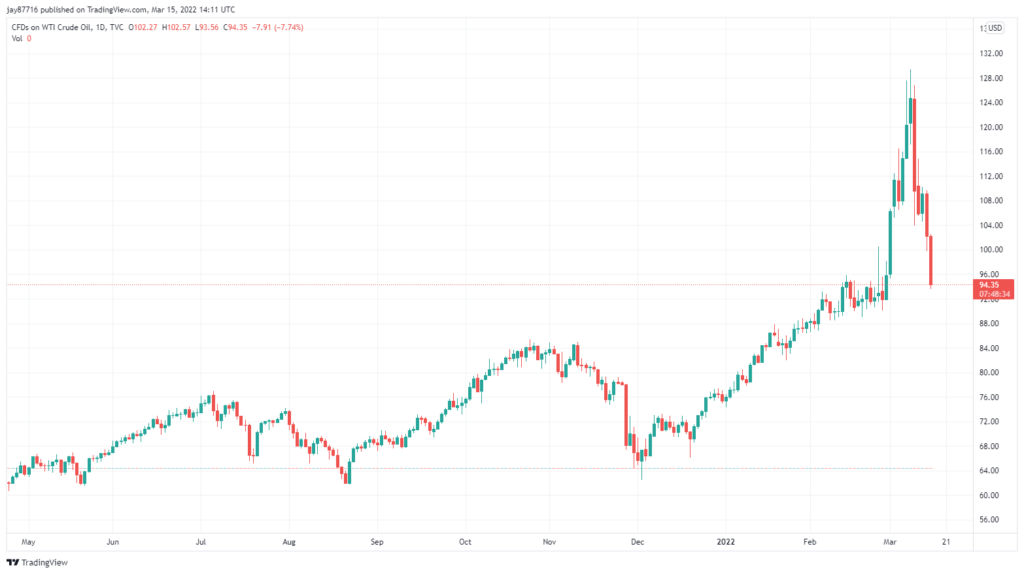 Whatever the case may be, WTI at the time of writing is sitting slightly about $94.50 a barrel, down approximately 7.5% on the days session.