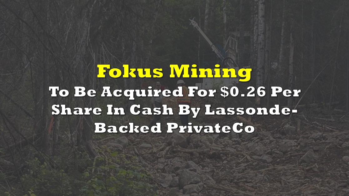 Fokus Mining (TSXV: FKM) shareholders are set to be paid out in cash following an announcement this morning that the company has agreed to be acquired. The arrangement will see the privately held Gold Candle Ltd acquire the company for cash following the signing of a definitive agreement.