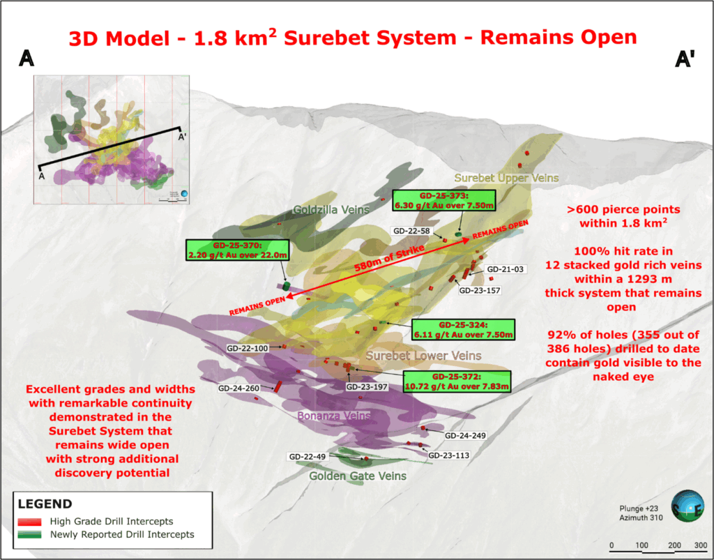 - GD-25-373: 6.30 g/t gold over 7.50 metres from a depth of 207.00 metres