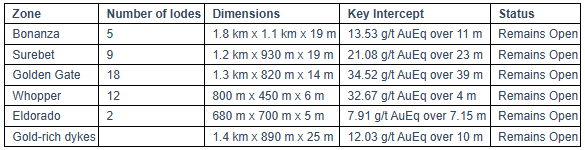 The zones are said to have strike length that range from 680 metres for the Eldorado zone to 1.8 kilometres for the Bonanza zone, while the lodes ranging from combined thicknesses of 7 metres at Eldorado to up to 30 metres at Surebet.