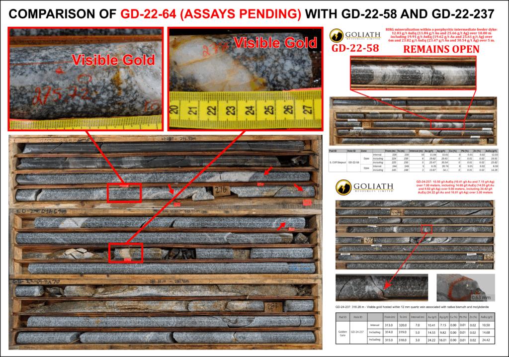 “The identification of visible gold within this new dyke interval in hole GD-22-64 is a highly encouraging start to our 2025 drill exploration program at Surebet. The strong similarities to previously drilled, high-grade intercepts within these RIRG dykes reinforce our belief that we are in close proximity to a significant gold-rich intrusive source,” commented Roger Rosmus, CEO of Goliath Resources.