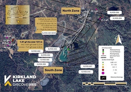 A 75-meter step-out hole, KLM26-002, hit 121 meters of continuous gold mineralization at an average grade of 1.01 g/t from a depth of 11 metres. The results are being viewed as a validation of the company’s geological model, which seeks to prove that the South Zone is part of a much wider, prolific system rather than a series of isolated pockets.