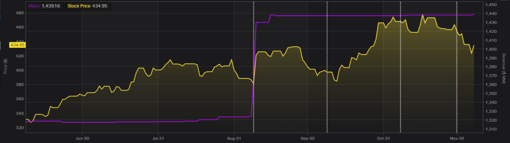 Lululemon Athletica (NASDAQ: LULU) will be reporting its third quarter financial results on December 9th after the market closes. Analysts have a consensus $468.57 12-month price target on the company, via a total of 31 analysts, with 9 analysts having strong buy ratings, 12 having buy ratings and the last 10 analysts have hold ratings. The street high comes in at $570 price target, and the lowest target sits at $344.