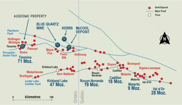 | Blue Quartz | 640 ha | Past producer; open at depth | McEwen Mining (Black Fox) |