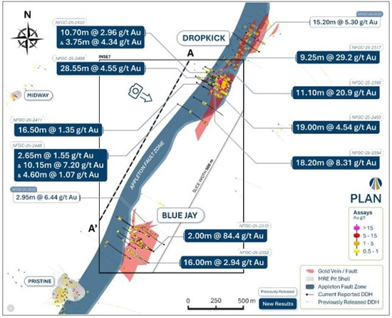 The results are said to have expanded the mineralized footprint of Dropkick to 815 metres along strike and to a depth of 285 metres, with the latest assays expanding strike by approximately 75 metres. The zone remains open both along strike and to depth, with ongoing step out drilling focused on expanding the fault zone along strike to the north and to the south. The zone is found 11 kilometres to the north of AFZ Core, and is the most northern discovery to date along the Appleton Fault.