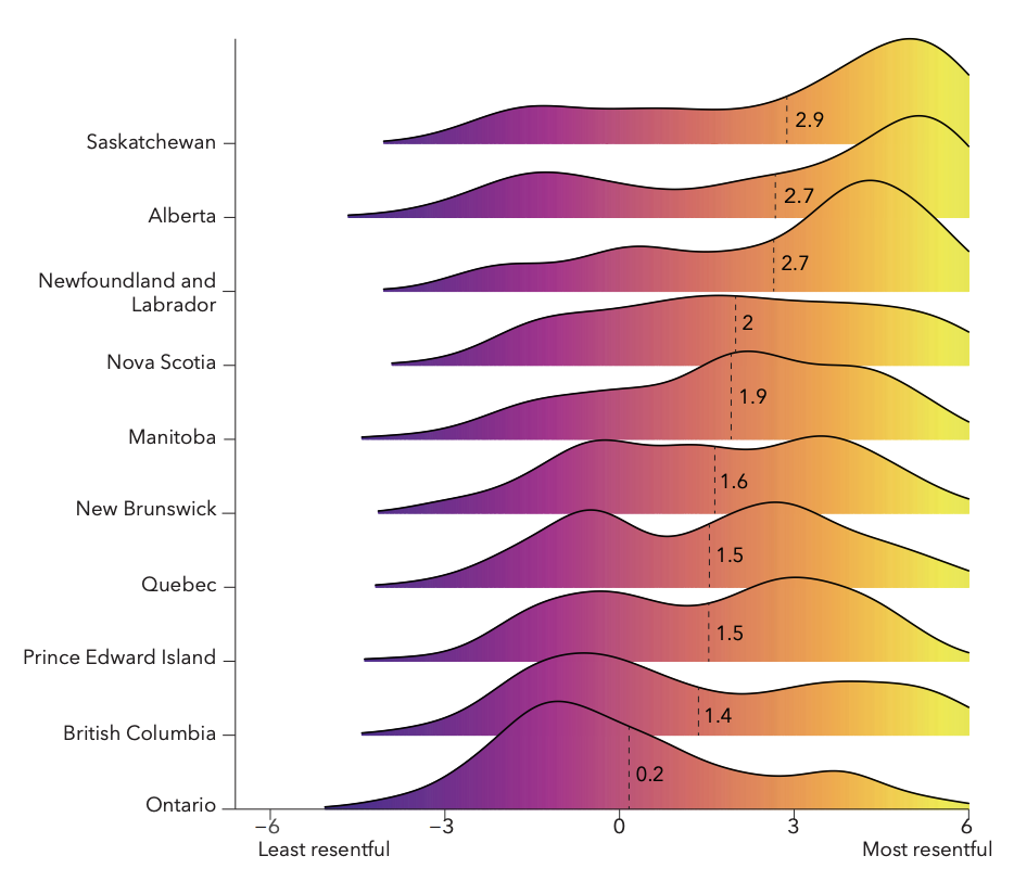 To get a picture of how resentful or aggrieved Canadians are about the place of their province in the federation, they combined responses to questions about the fairness of federal programs and transfers, their perception of whether a province gets due respect, whether their province has a distinct culture that’s misunderstood by Canadians in other provinces, whether it has its fair share of influence on national decisions, and whether the four major regions of the country contribute their fair share to the country.