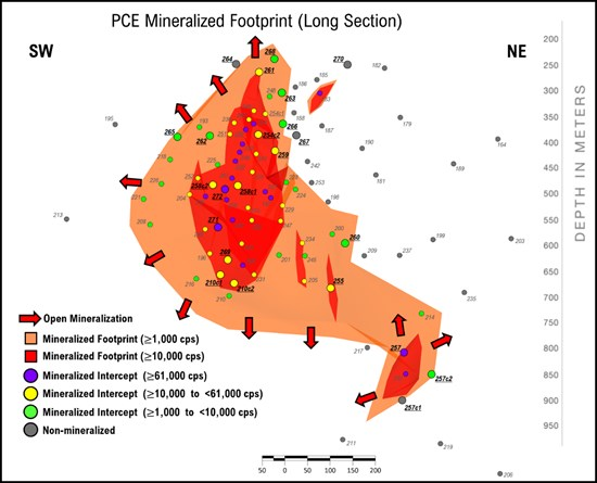 Overall drilling at PCE now totals 69,042.2 metres across 102 drillholes, with 67 of those holes said to have intersected mineralization, including 45 holes that encountered high grade (>10,000 cps), and 17 holes that encountered off-scale (>61,000 cps) mineralization.