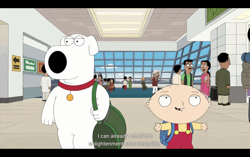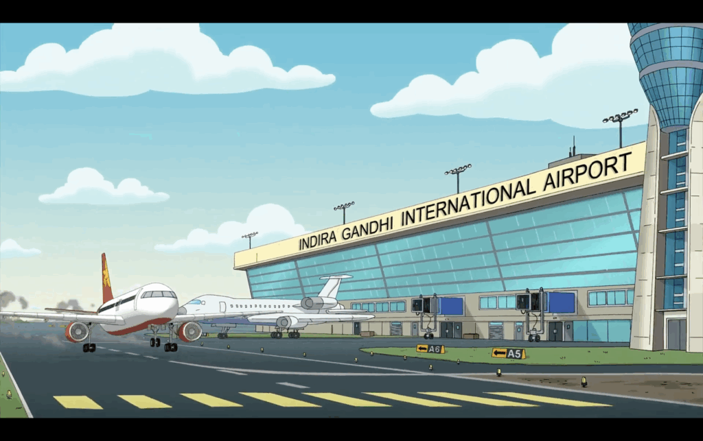 In the actual episode, the airport exterior is clearly labeled “Indira Gandhi International Airport.” The same sequence then shows Brian and Stewie inside the terminal with the same lines from the online clip, albeit it was changed to Canada.
