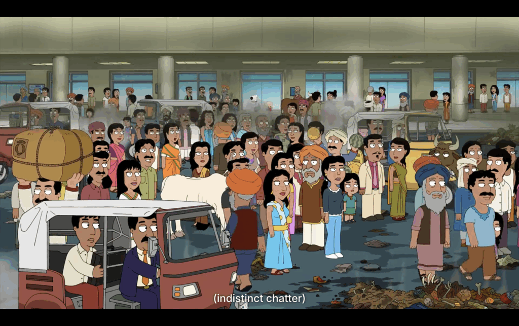 In the reposted clip, the airport is presented as Toronto Pearson, and the social caption tells viewers that “Stewie & Brian visit Canada.” The dirty crowd shot is then made to read as a joke about Canada being filthy and chaotic. But that crowd shot matches the India sequence, not a separate Canada trip.
