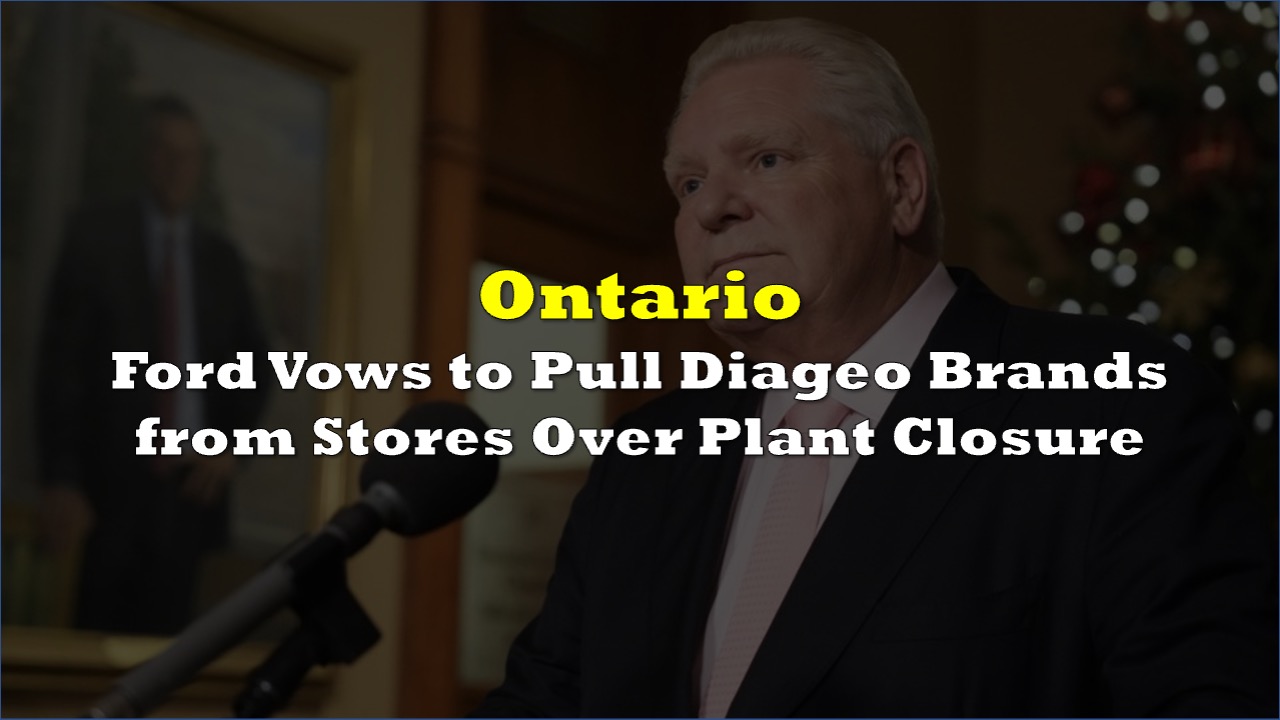 Ontario Premier Doug Ford says the province will remove all Diageo-owned alcohol brands from government liquor stores when the spirits giant closes its Crown Royal bottling plant next year, affecting roughly 200 workers.