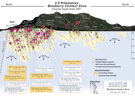 Scottie Resources (TSXV: SCOT) this morning released assay results from their 2025 exploration program focused on the Blueberry Contact within their flagship Scottie Mine project. High grade gold continues to be intersected at the zone, particularly within the BB Vein.