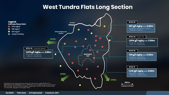 - WT25-37: 726 g/t silver equivalent (249 g/t silver, 0.69 g/t gold, 6.16% zinc, 3.43% lead, 0.12% copper) over 3.0 metres from a depth of 241.60 metres