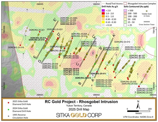 “With visible gold observed in sheeted quartz veining across the entire 1.1 kilometre strike drilled this year and assays now confirming gold mineralization over 575 metres of strike, Rhosgobel is rapidly emerging as a significant new gold discovery within our RC Gold Project. The fact that 16 of the first 17 holes have returned intersections exceeding 100 gram-metres of gold further underscores both the scale and consistency of this system. We eagerly await results from the remaining 26 holes completed at Rhosgobel as we continue to define the size and potential of this exciting new gold zone,” commented Cor Coe, CEO of Sitka Gold.