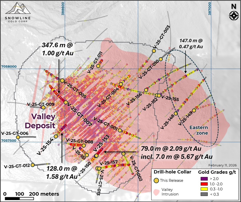 - V-25-154: 1.58 g/t gold over 128.0 metres from a depth of 31.00 metres