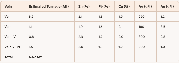 A 2022 non-NI 43-101 compliant geological report identified that conceptual resources of up to 6.62 million tons exists on site, with grades of 2.1% zinc, 1.8% lead, 1.5-2.1% copper, and up to 3.5 g/t gold in select zones. XRF-measured grades from inside the mine are said to show strong potential for significantly higher metal grades in some areas that are more consistent with historical mining results.