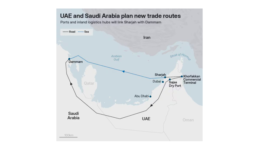 The UAE is advancing a Sharjah-to-Saudi trade corridor that would reroute cargo around the Strait of Hormuz, shifting part of Gulf logistics toward the Gulf of Oman and reducing dependence on a chokepoint that handles roughly 20% of global oil trade.