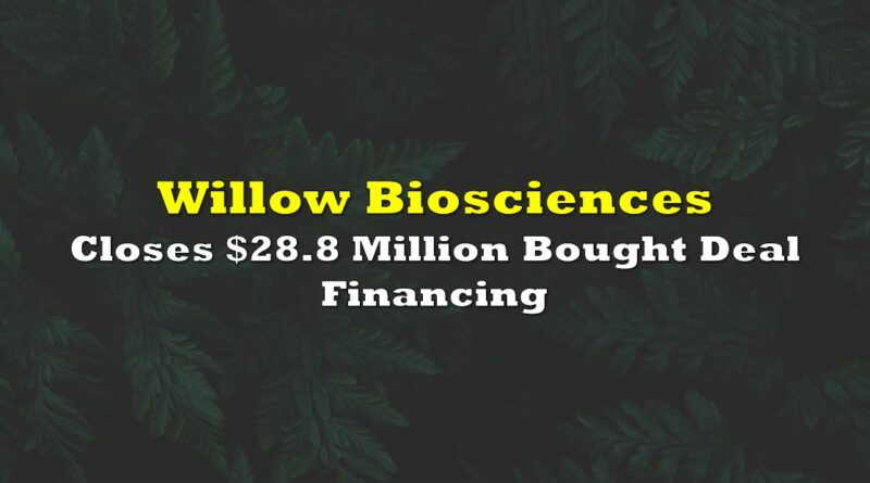 Willow Biosciences (TSX: WLLW) on Friday closed their previously announced bought deal financing. The company raised a total of $28.8 million in gross proceeds, which includes the full exercise of the over-allotment option issued in connection with the offering.